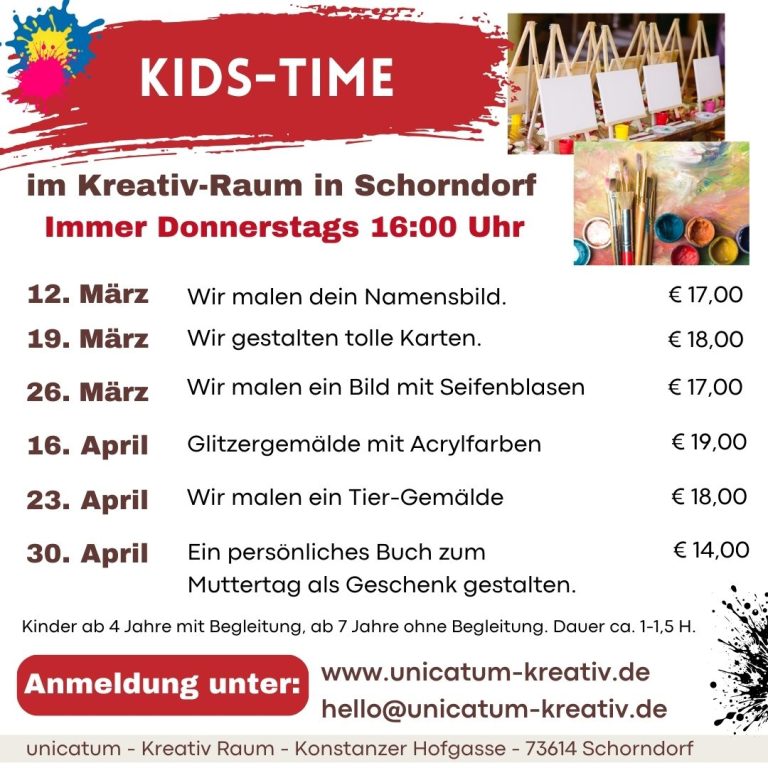 Immer Donnerstag nachmittag ab 16:00 Uhr darfst du kreativ sein. Wähle dein Thema aus und komm vorbei. Ab 4 Jahren in Begleitung eines Erwachsenen und ab 7 Jahren darfst du gerne alleine bleiben. Sei dabei.